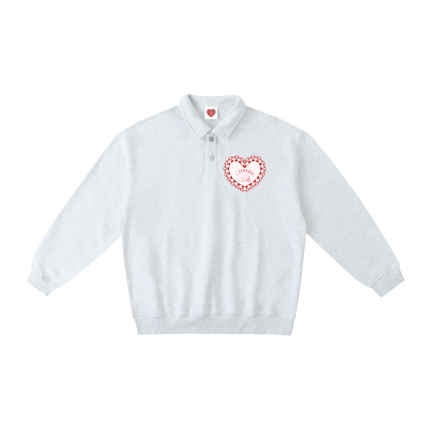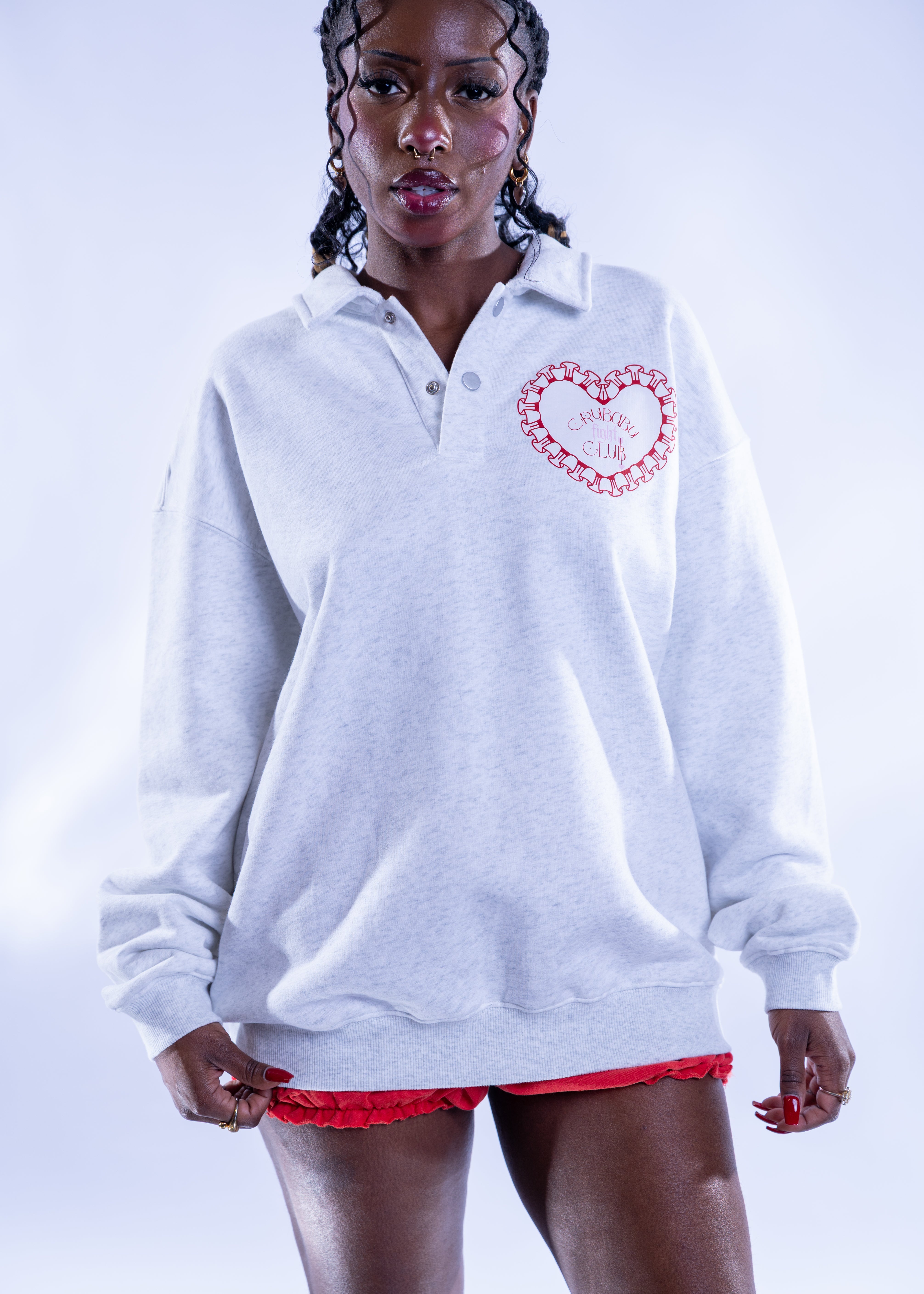 Cut from cozy heather-gray fleece, this polo-style pullover blends softness with statement, making it the perfect uniform for lounging, protesting, or yearning.