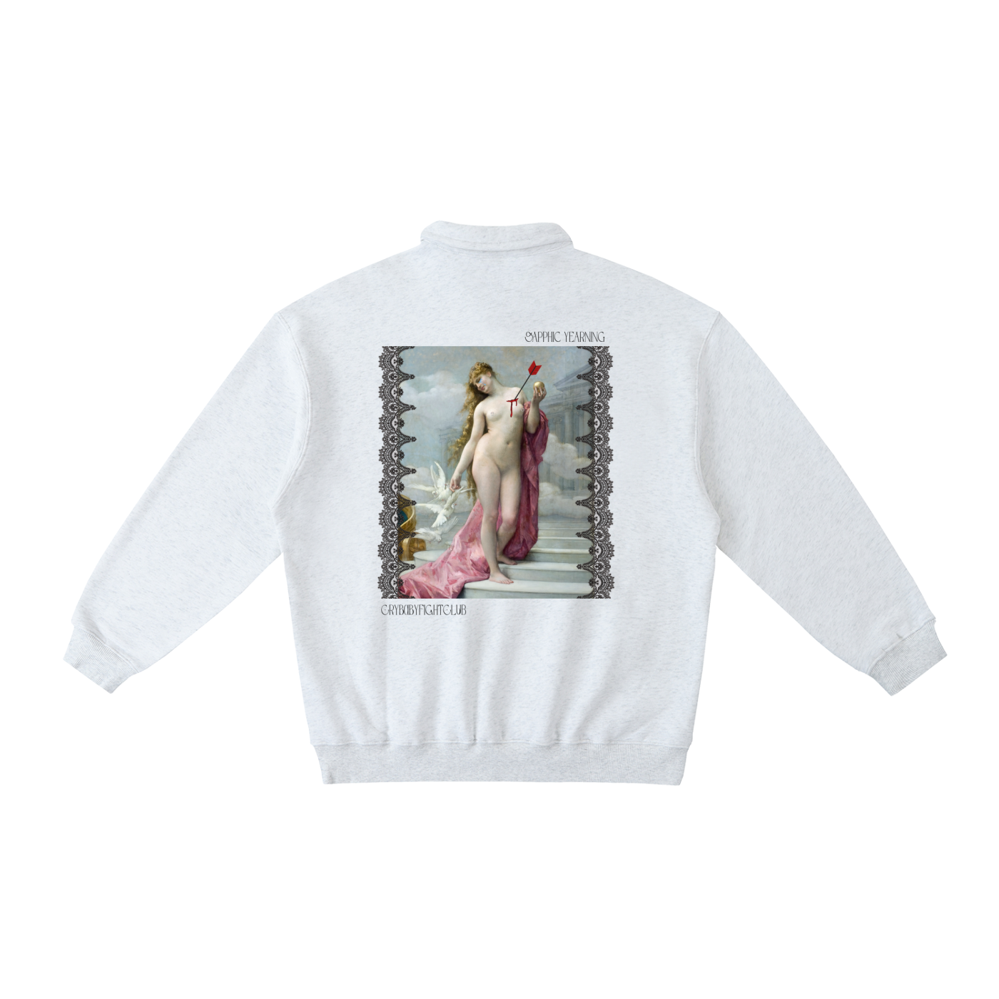 Romance and rebellion stitched into one. The Sapphic Yearning Polo-collared sweatshirt features a reimagined classical painting framed with gothic lace detailing. A lone goddess, pierced in the heart by a crimson arrow, gazes with defiance and desire—an ode to queer longing and untamed femininity.