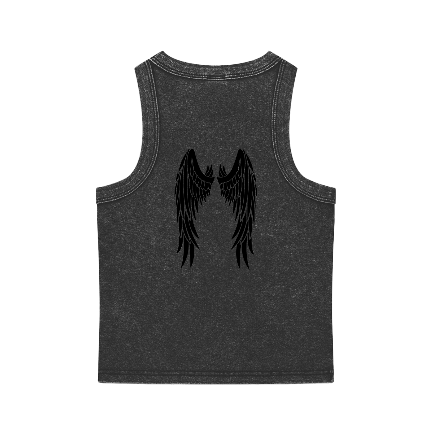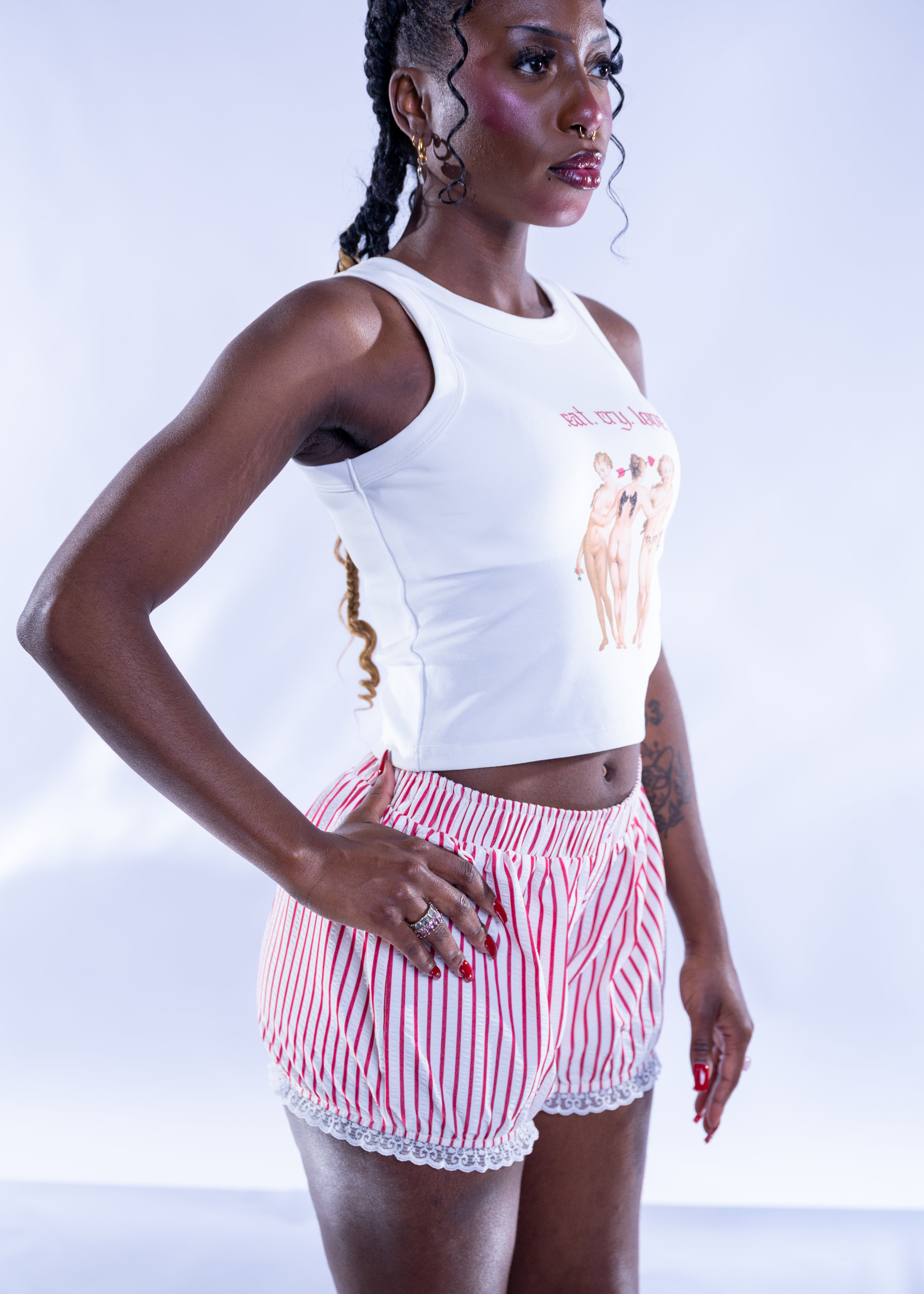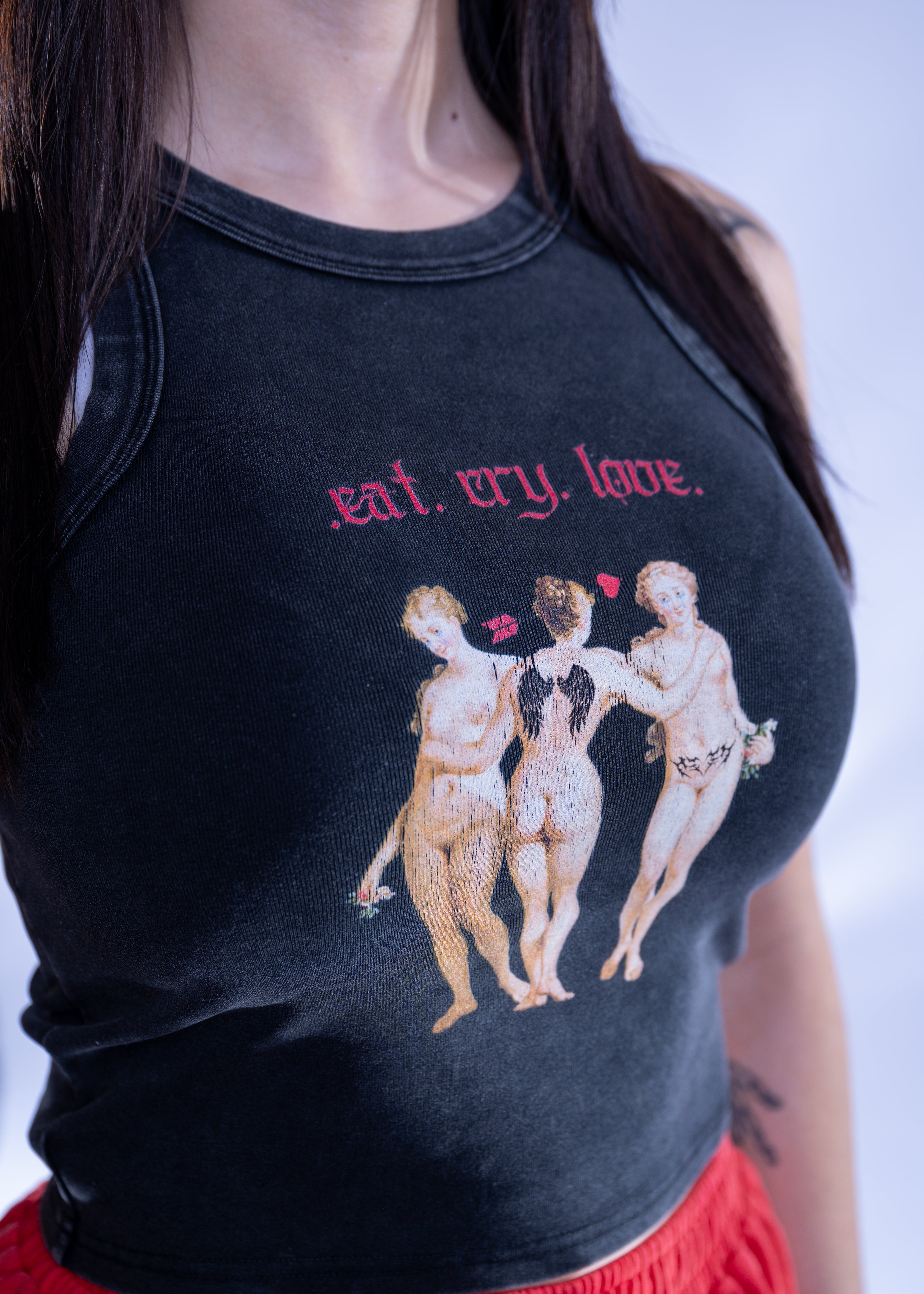 Part heartbreak anthem, part heavenly armor. This perfect versatile stretch tank fuses edge and drama. The front features a reimagined classical artwork of The Three Graces, tatted up and shot through with Cupid’s arrow and stamped with the bold mantra “eat. cry. love.” in gothic red lettering. The back is finished with a striking black wing graphic, giving you a fallen angel energy that’s both soft and defiant.