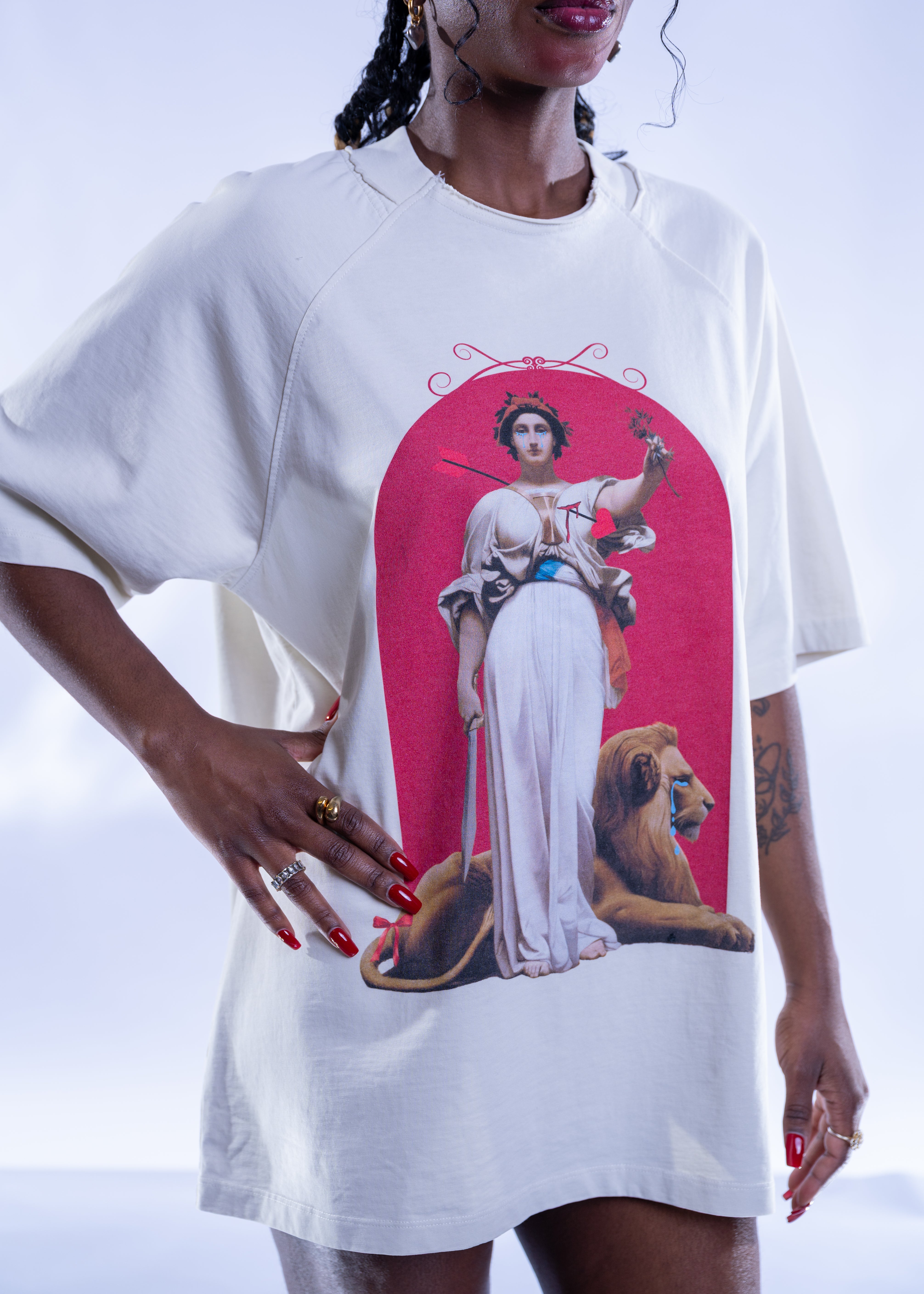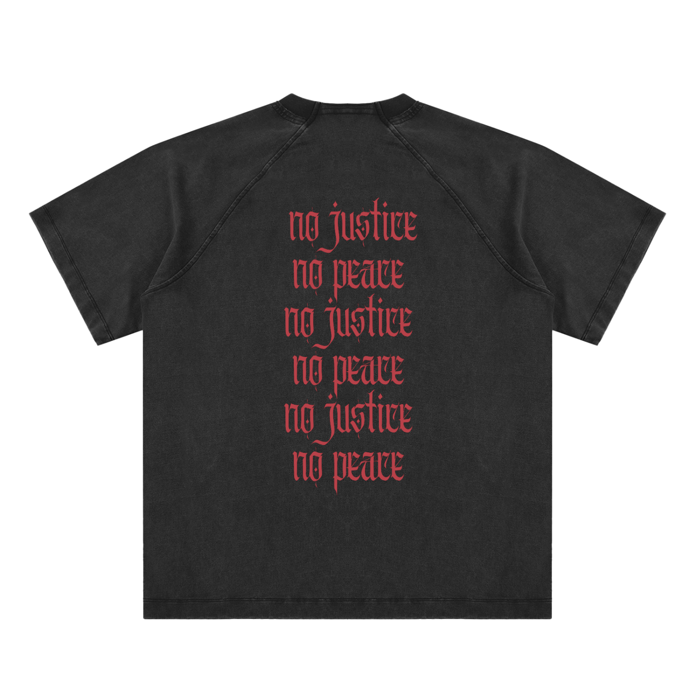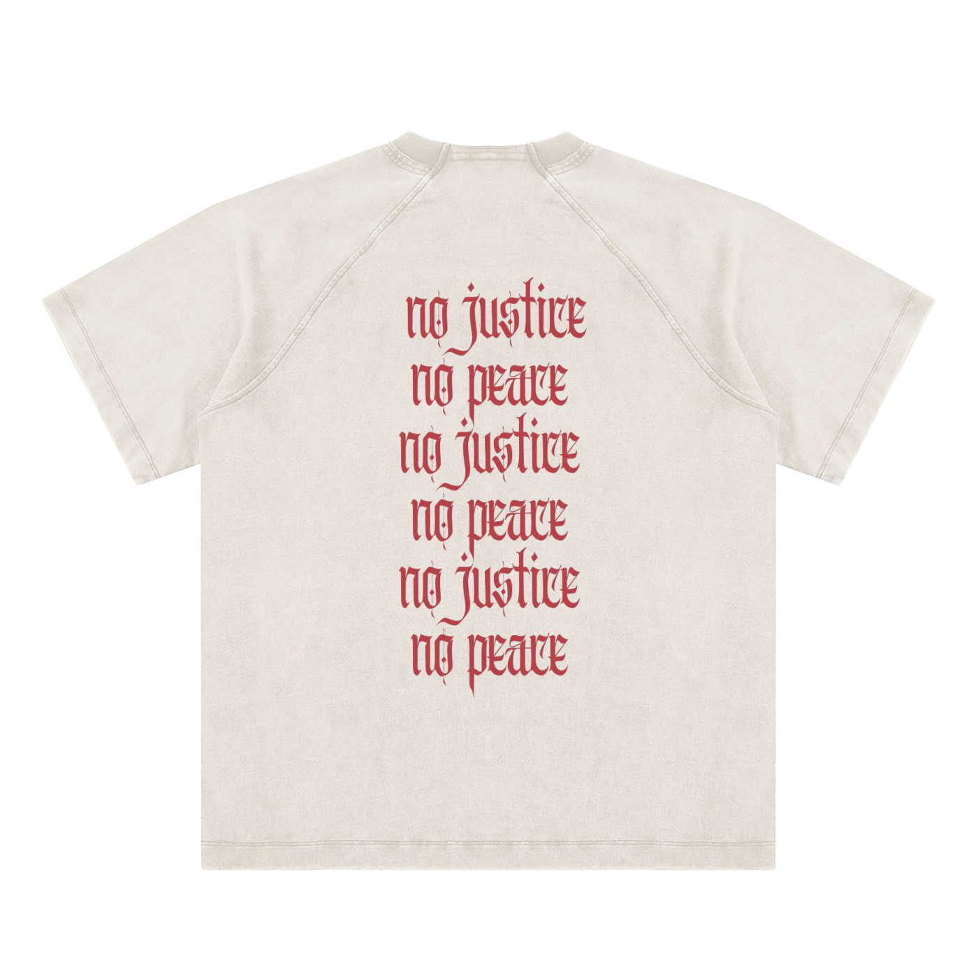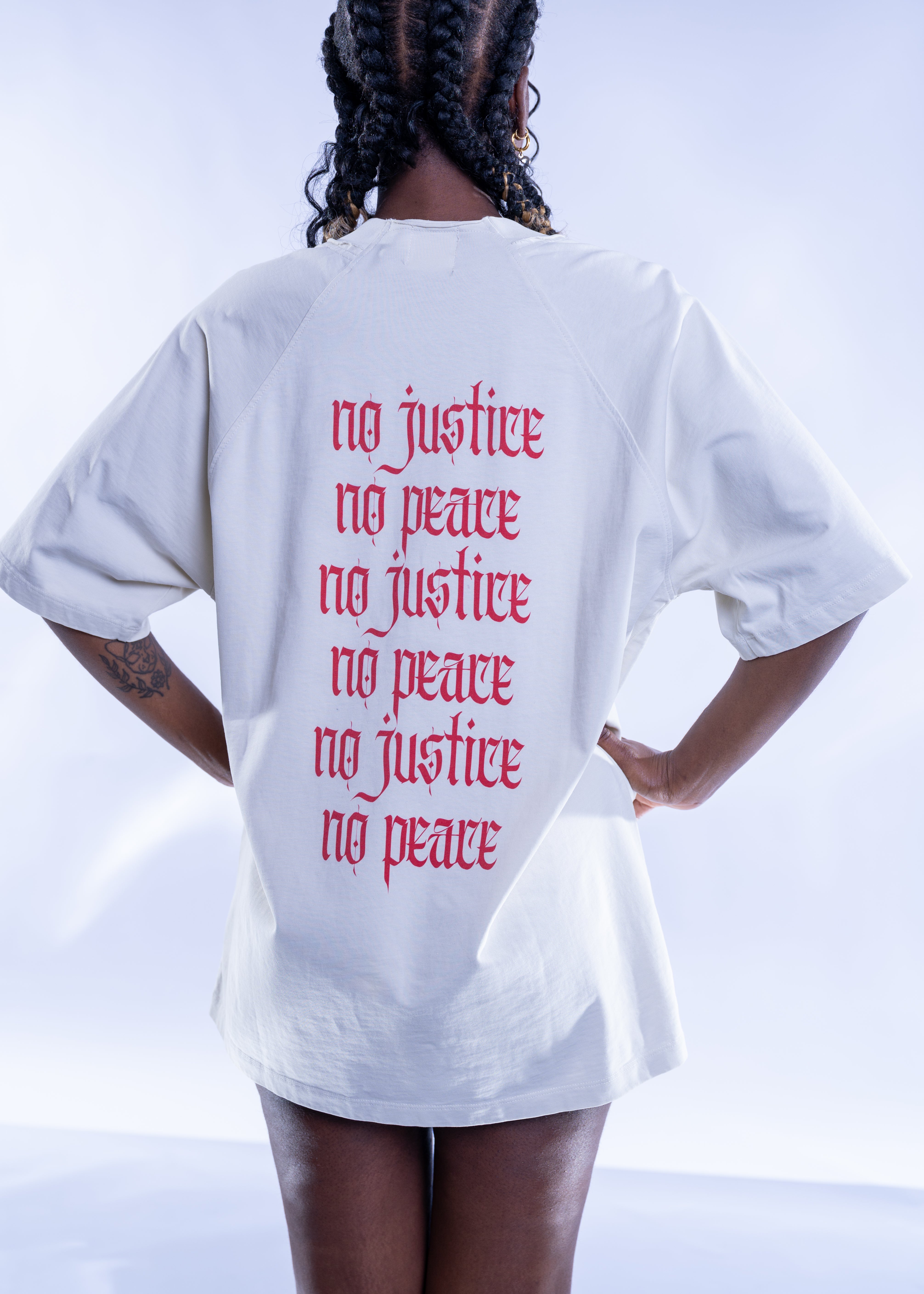 A statement in every stitch. This raglan tee channels defiance and divine power with a bold art-forward graphic of a crying goddess draped in white, sword in hand, and a delicate flower in the other, standing strong beside her lion companion with tears painted blue and bow adorned tail. Arrows pierce her, yet she remains unshaken—a symbol of resilience in the fight for truth. The back makes the message crystal clear, repeating in gothic red script: “no justice, no peace.”