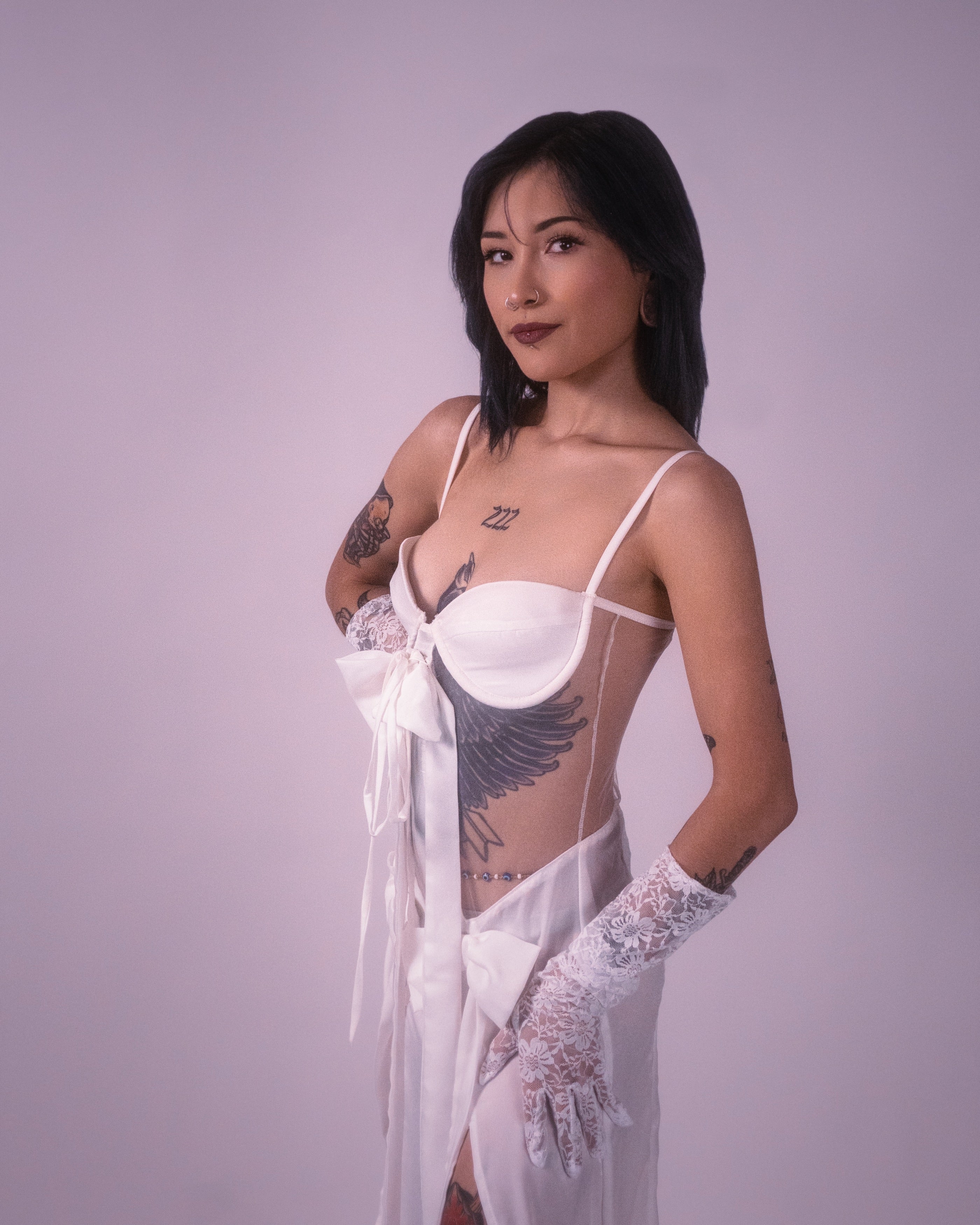Designed with a soft ribbon accent and a flowing split front, the silhouette feels weightless and intentional. The front opening creates movement and breath, allowing the body to exist freely within the garment rather than be confined by it. Gentle ties and sheer elements evoke tenderness and care—beauty that protects rather than overwhelms.